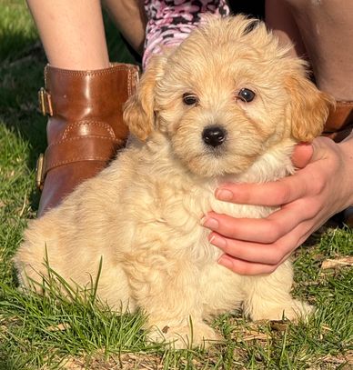 Fluffy tricolor puppy sitting on a cream leather couch.