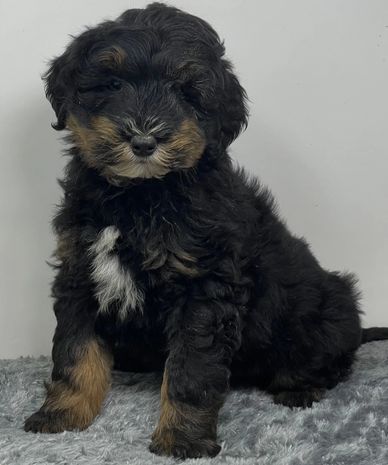 Fluffy black, brown, and white puppy sitting on a gray carpet.
